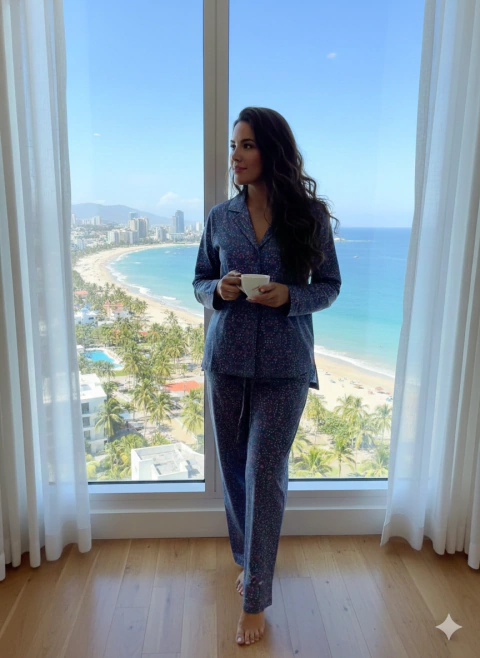 Descubrí la elegancia y comodidad del Pijama Roma, una prenda exclusiva que combina algodón 100% con seda para una sensación suave y fresca sobre tu piel. La chaqueta, con botones delicados, y el pantalón ancho tipo palazzo, con un lazo del mismo género, ofrecen un estilo relajado pero sofisticado, ideal para esos momentos de descanso con glamour.
